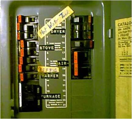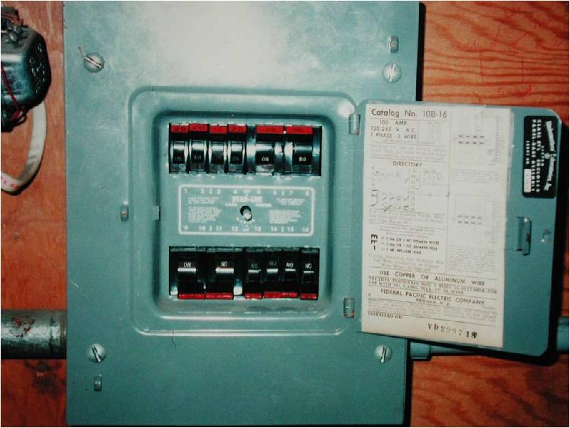 · Of all the hazardous conditions reported in FPE breakers, only one unsafe condition is visible without dismantling. FPE breaker toggles in the “on” position often are out of straight line, in a “jagged tooth”-type pattern (a panel being tested illustrates these jagged rows below). Typically, this shows lockup, failures to reset or improper breaker seating; it also can result from clogging and age. Mr. Leathers believes panels like that should be replaced, since the cost of live current testing or replacing FPE breakers usually is more than installing a modern panel. We agree.)