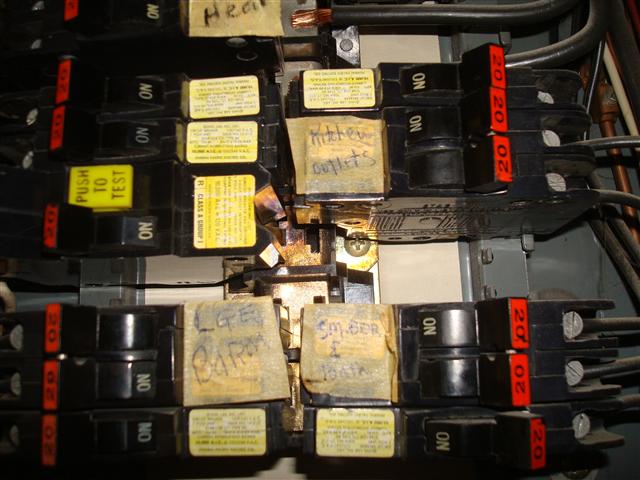 “The central safety defect in FPE Stab-Lok(R) electrical equipment is that FPE Stab-Lok circuit breakers fail to trip under overload or short-circuit conditions, at a failure rate much higher than comparable equipment made by other producers. This failure to trip occurs up to 80% of the time when the breakers are called-on to trip, depending on the individual breaker type and ampacity. The usual industry rate of failure of a circuit breaker to trip in response to an overcurrent or short circuit is much less than 1%. When an overload or short circuit occurs in an electrical device, say an electric clothes dryer, the circuit supplying electricity to the device is supposed to be interrupted, electrical power cut off, by either a fuse or a circuit breaker. This interruption of electrical power is intended to minimize the resulting fire hazard of electrical overloads or short circuits. A circuit breaker that fails to trip is unsafe fails to protect the electrical circuit and the building and building occupants where that circuit breaker is installed. This can lead to fire, property loss, and injury or worse,” reports Daniel Friedman, principal author/editor of the InspectAPedia website, www.inspect-ny.com/fpe/fpepanel.html. (Friedman is the former chairman of ASHI’s national Technical Committee and Education Committee, as well as author of The ASHI Reporter’s _______ article on FPE. His photo of a burned out FPE breaker below is gratefully acknowledged.)